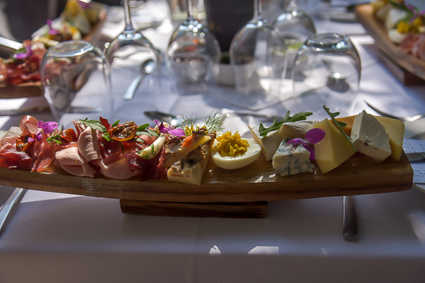 die Weinprobe vorbereitet. Wir lassen uns richtig verwöhnen. Denn Herr Koch ist ein begnadeter Koch - so stehts im Internet - und das spüren wir auch. In einer tollen Umgebung - draußen im Freien, kosten