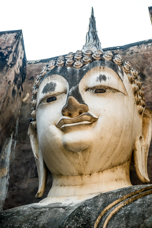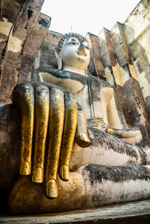 | Buddhabildnis in Sukhothai. Der scheinbar durch die schmale Öffnung des Tempels spähende Buddha, wie auch seine elegante, zugespitzte Hand gehören zu den beliebtesten Postkarten- und Fotomotiven in Alt-Sukhothai. Wie gelingt es mir nur, diesen riesigen Buddha auf ein Foto zu bekommen. Ganz einfach ein |