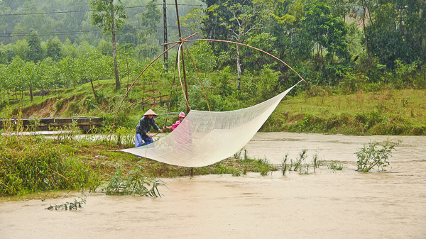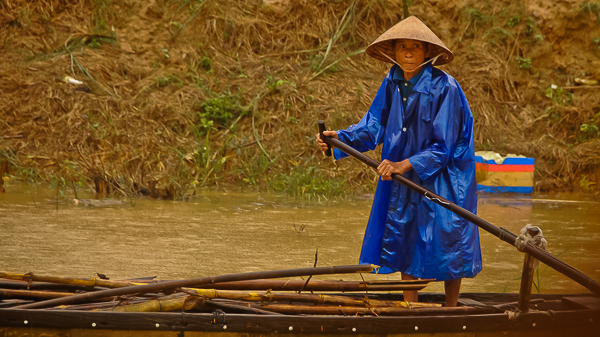 Fluss - den Einheimischen scheint der Regen nicht wirklich viel auszumachen. Sie versehen ihre Arbeit auf den kleinen Booten und treiben an uns vorbei. Der Fluss speist sich aus zwei Quellflüssen, die im Trurong Son Gebirgszug entspringen. Der Fluss führt in Richtung Norden vorbei an den sieben