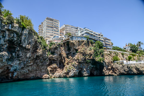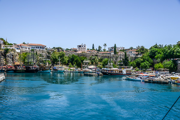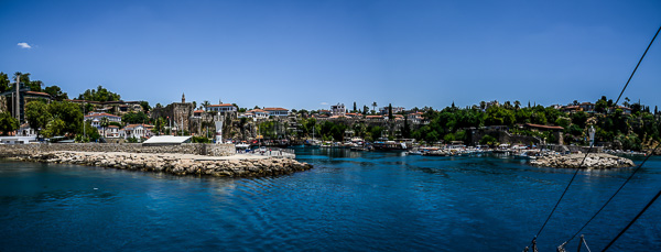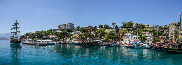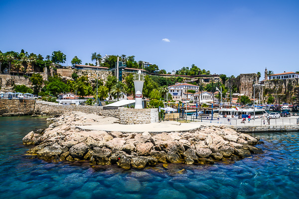 | rammt. Vorbei an einem kleinen Leuchtfeuer eröffnet sich uns nach wenigen Minuten ein wunderschöner Panorama-Blick auf die Altstadt und die Marina von Antalya. Das Wasser ist super blau, es sieht so aus, |